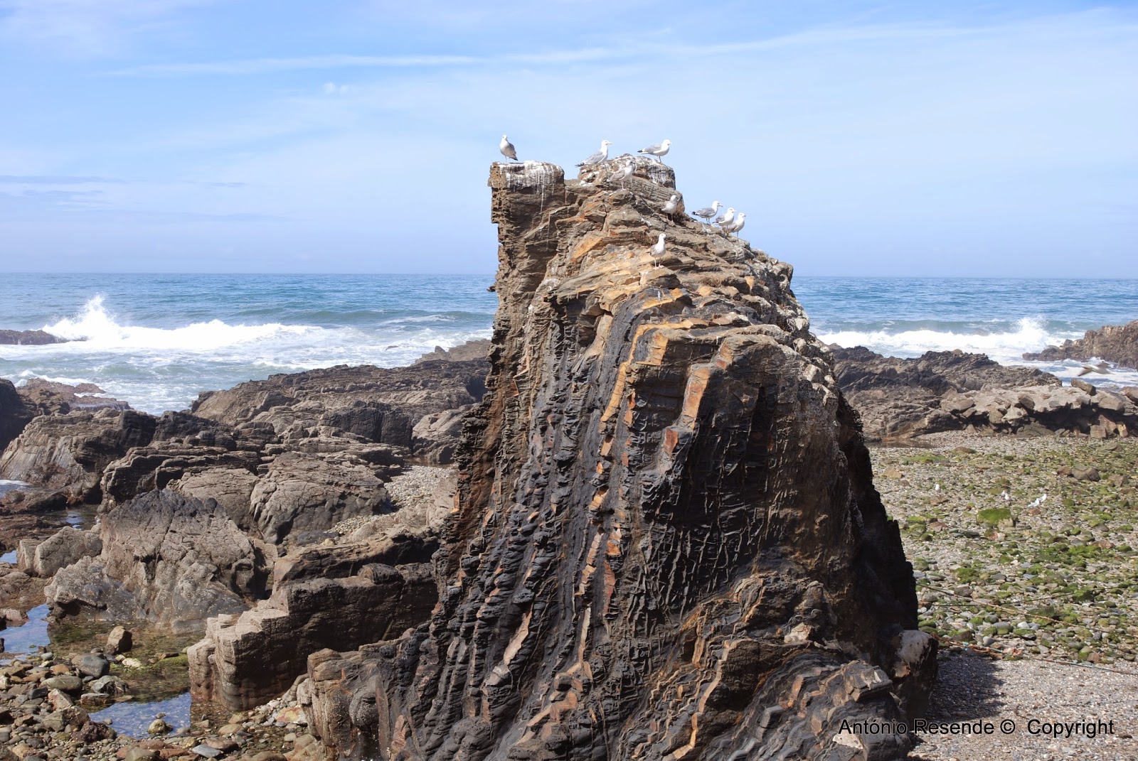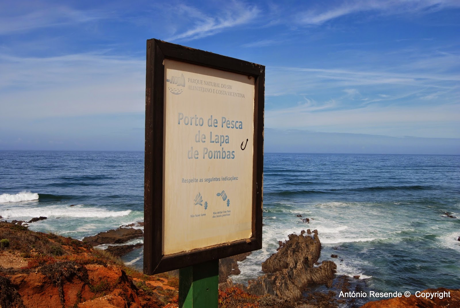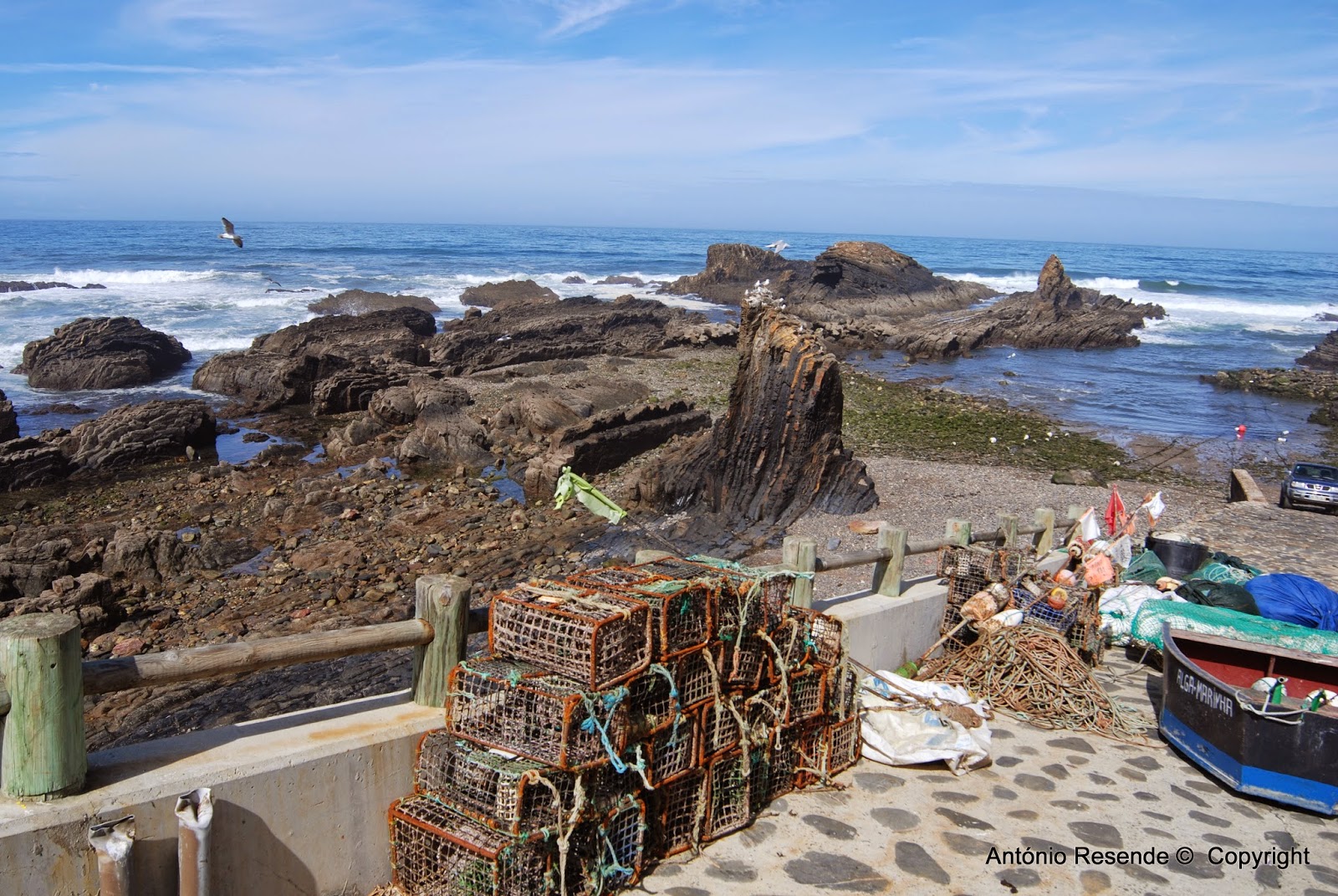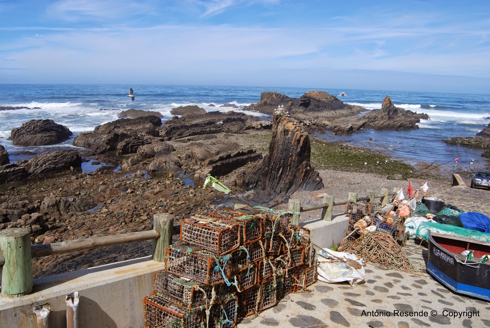 Da parte da manhã haveríamos de caminhar no estradão sul que nos faz passar por um espaço sobre o mar onde cinco AC por ali ficavam a residir. Mais um km percorrido e o estradão desemboca numa descida para o mar onde se situa o porto de Pesca artesanal  - Lapa de Pombas cuja visita é obrigatória.