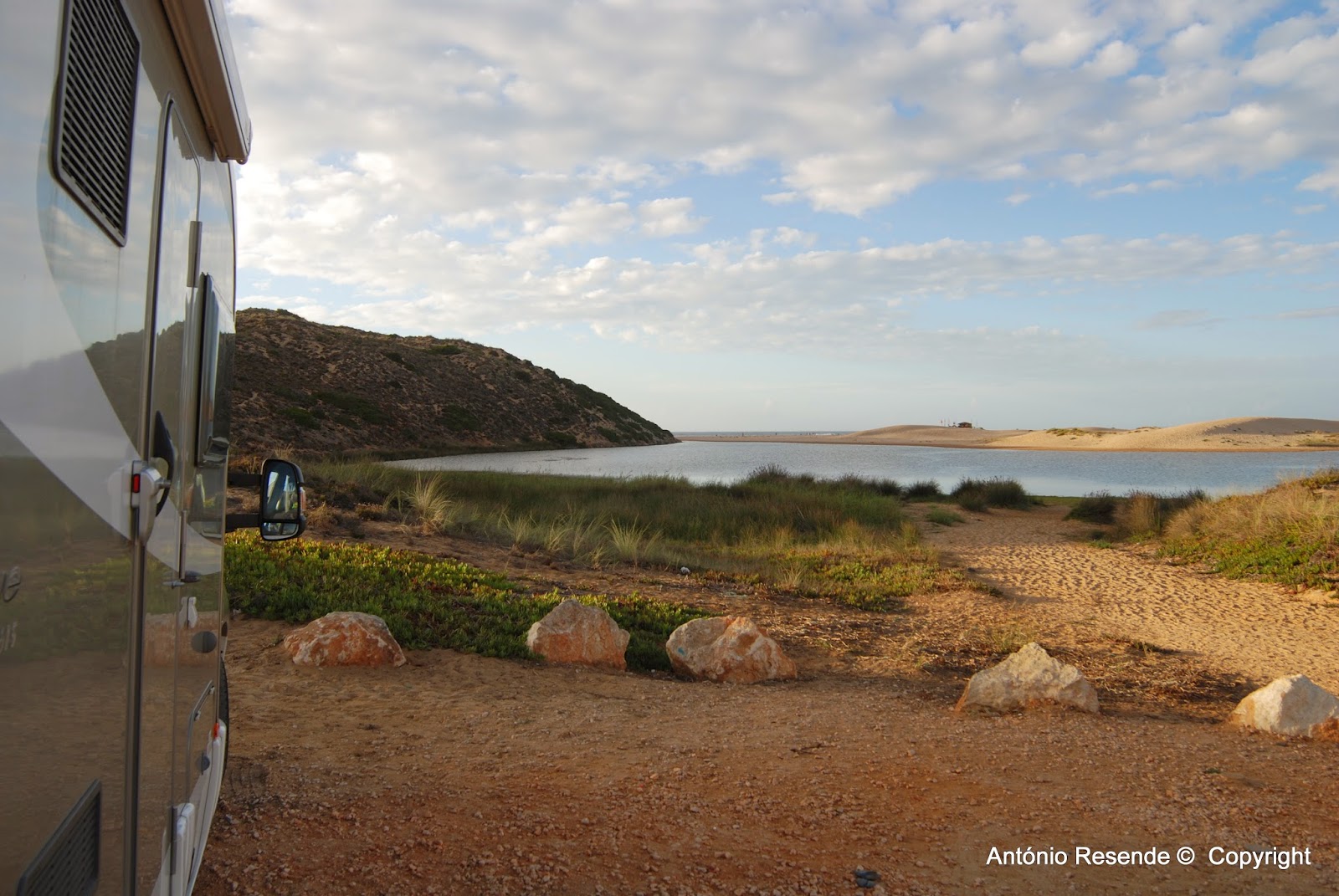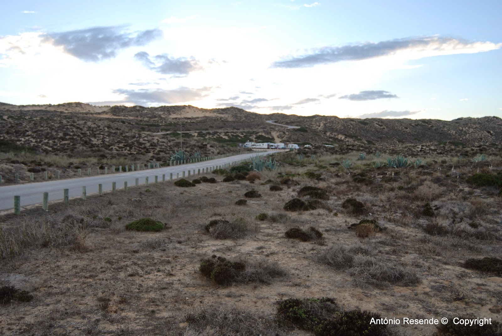 À noite percorremos a pé, o estradão que dali acompanha a costa uns dois kilómetros onde no percurso escuro e ermo se encontravam uma meia dúzia de autocaravanas preparadas para passar a noite.