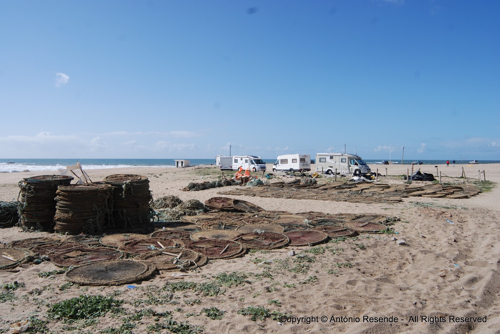 | Em Aver-O-Mar, mesmo se não aloja embarcações, os pescadores secam as artes no areal. |