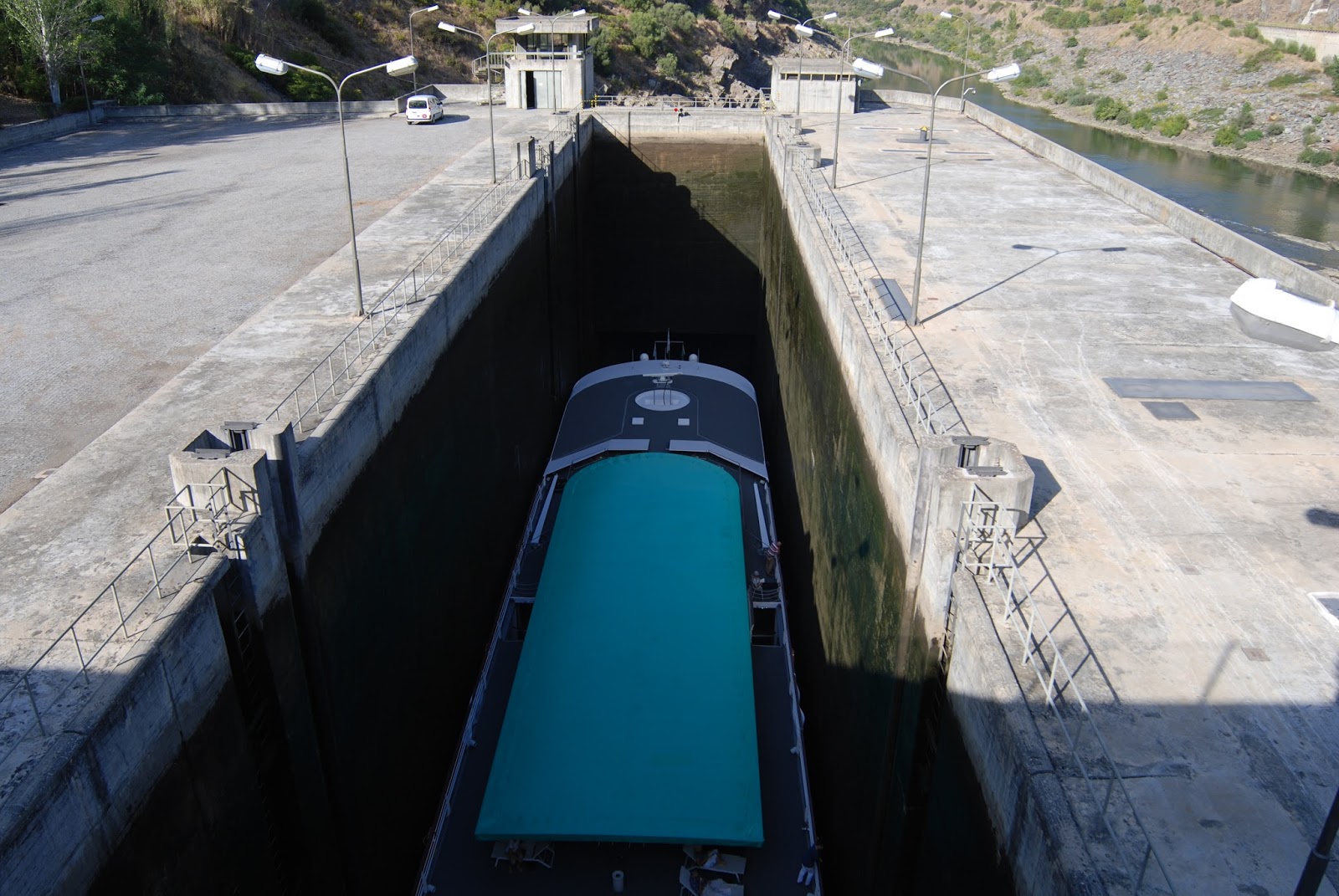 E à direita já se avista na eclusa o barco (pela cor da piscina) que aguarda a descida das águas... pera aí um bocadinho que a coisa leva tempo a vazar...