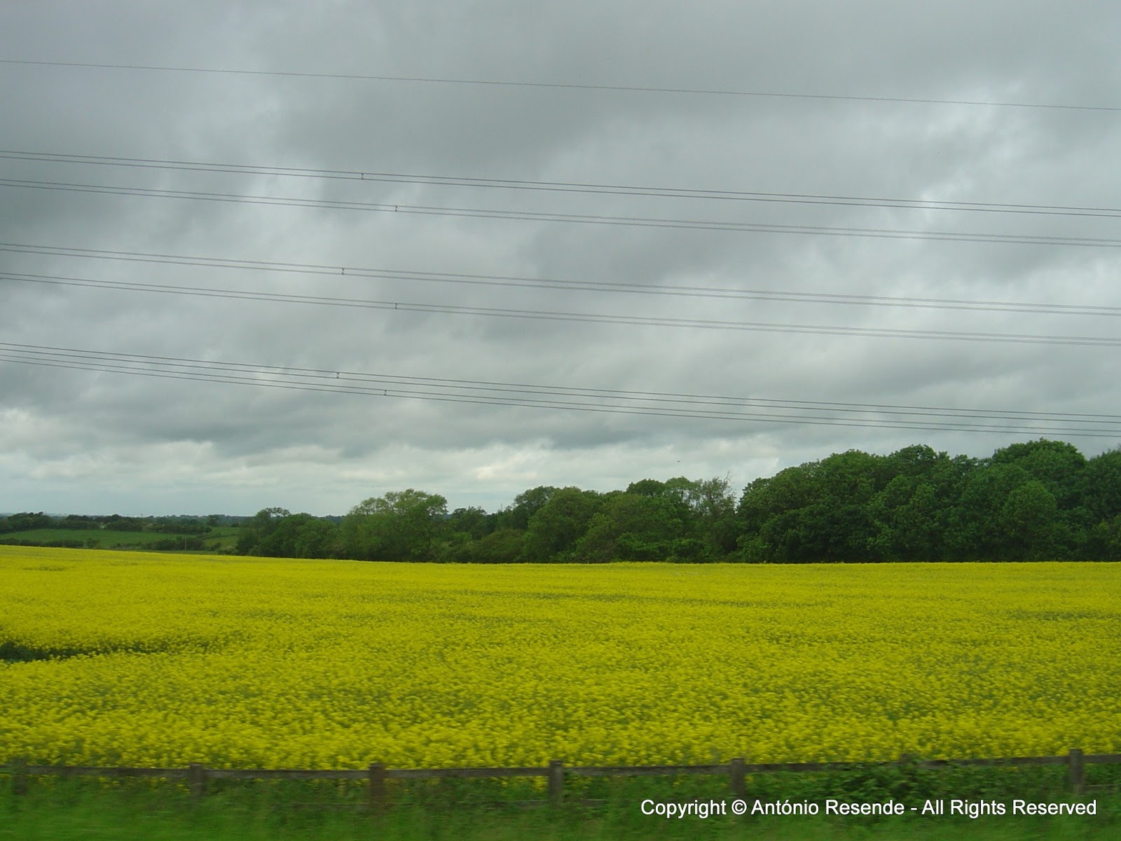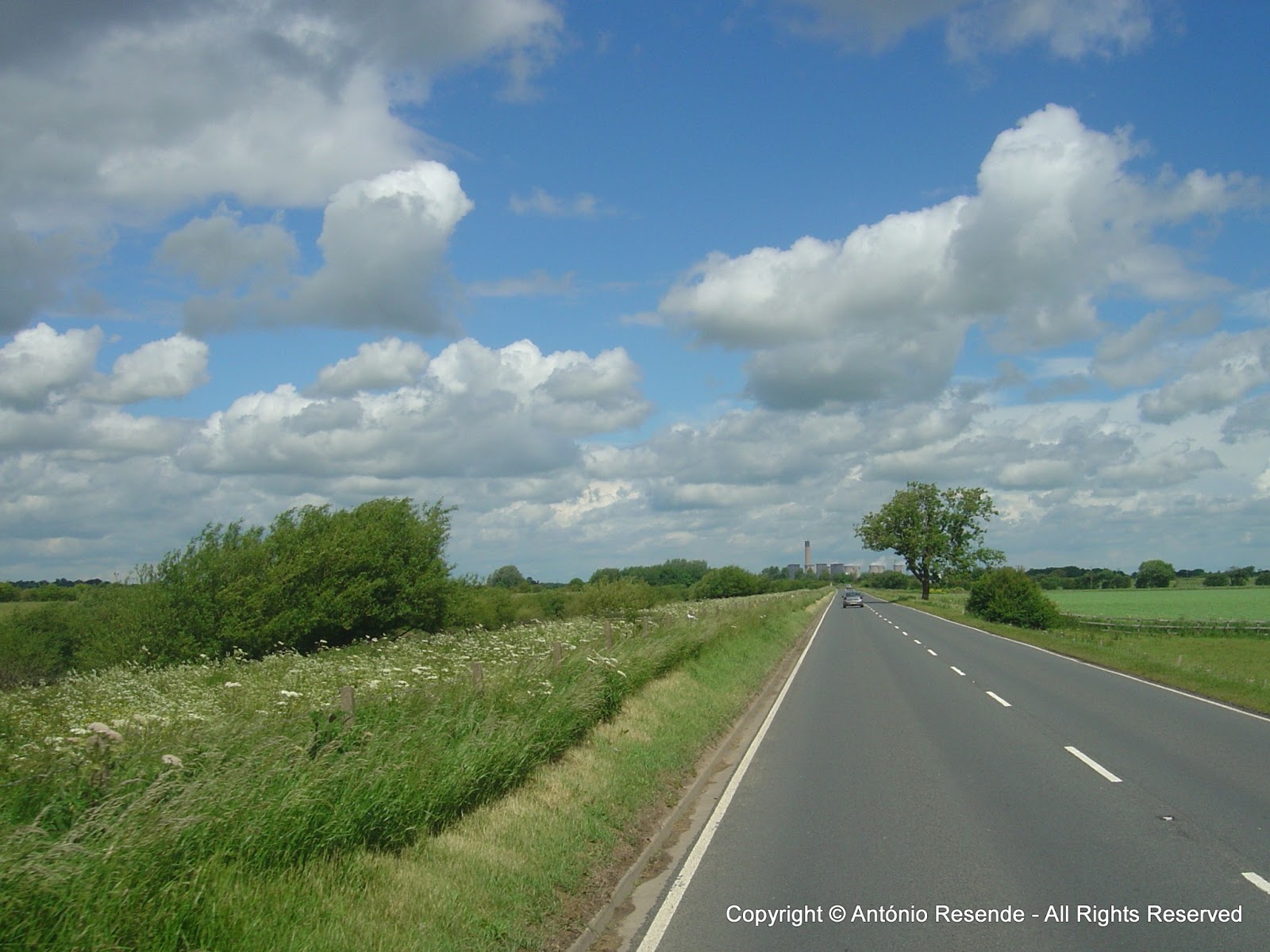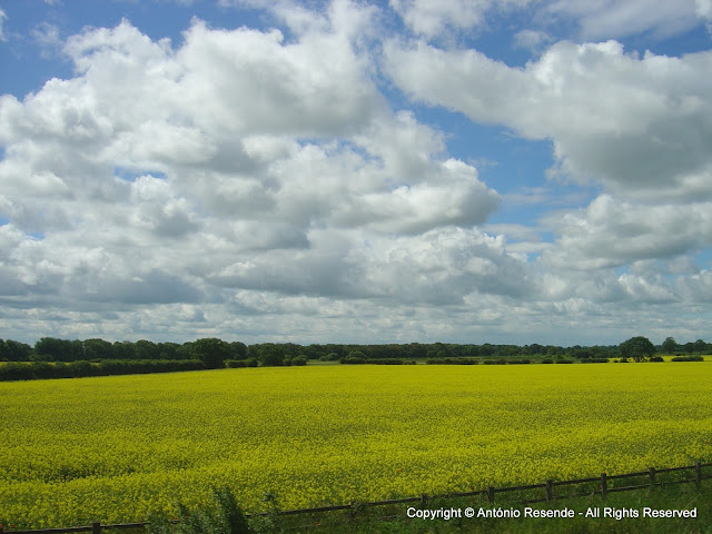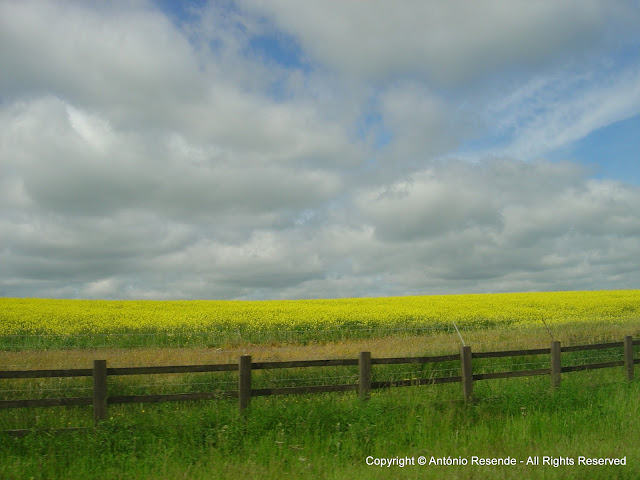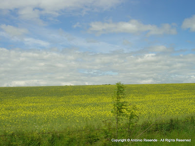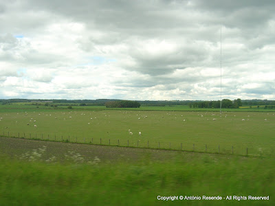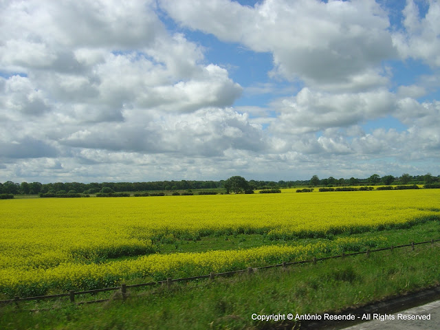 Ao longo de estradas e vias rápidas a paisagem de enormes planícies, entremeadas de frondosas árvores, repleta de  tons de verde e amarelo, com o céu azul mas encoberto de espaços de enormes flocos de nuvens quais gigantes de algodão branco.