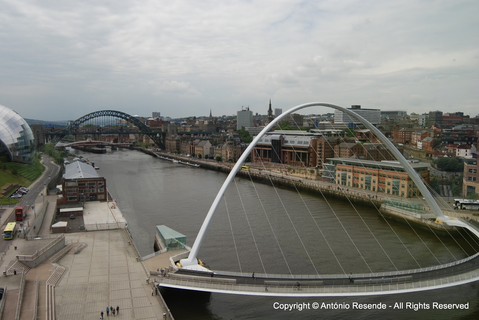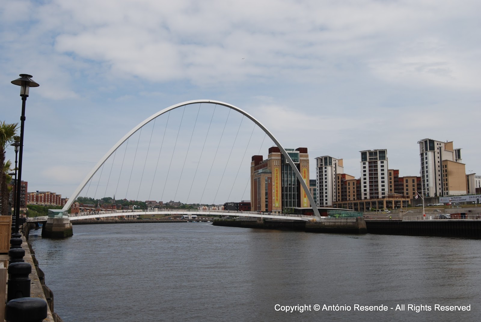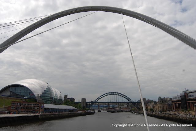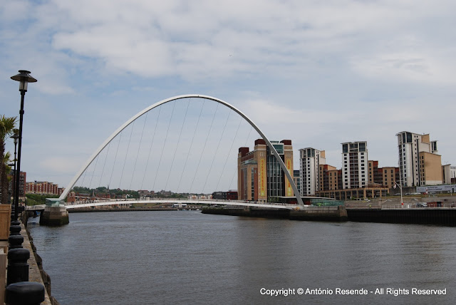Enquanto os meus amigos descansavam num minúsculo areal onde a petizada brincava como se estivera na praia, atravessei a moderna ponte pedonal ‘Gateshead Millennium Bridge’ ponte esta que me fascinou pelas suas linhas contemporâneas e pela  tecnologia que a faz subir para a passagem dos barcos.