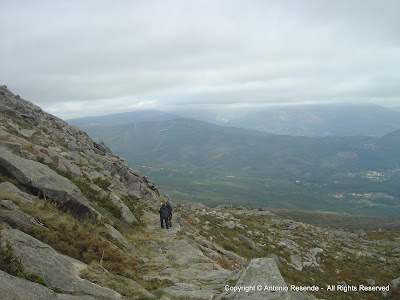 De novo com nuvens altas iniciamos a descida, chegando à parte onde em tempos idos e sem tecnologias, o homem criou um trilho/carreiro em enormes lajes de graníticas... impressionante toda aquela obra de antanho.