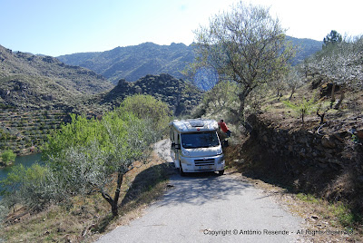 Ao passar na povoação, dada a estreiteza das ruas, questionamos uma local, que nos disse ser uma boa descida até ao rio e que tinha dúvidas que o caminho mesmo alcatroado permitisse a passagem da autocaravana. Arriscamos!