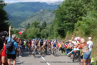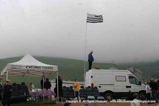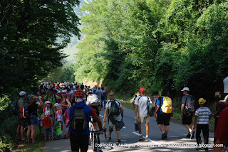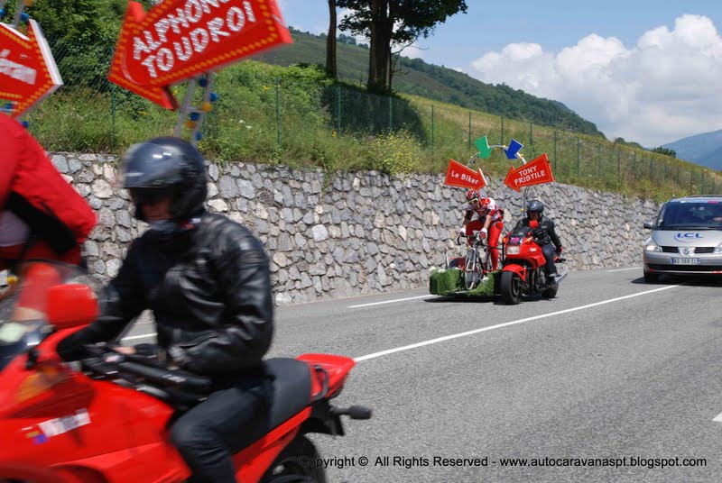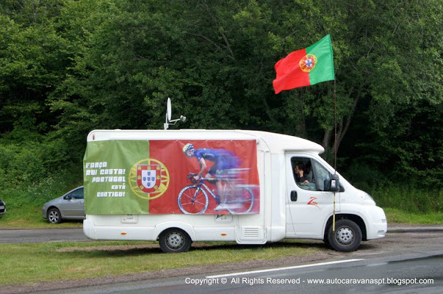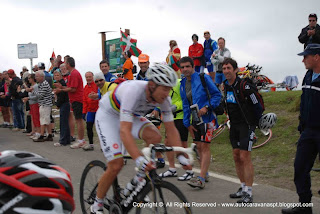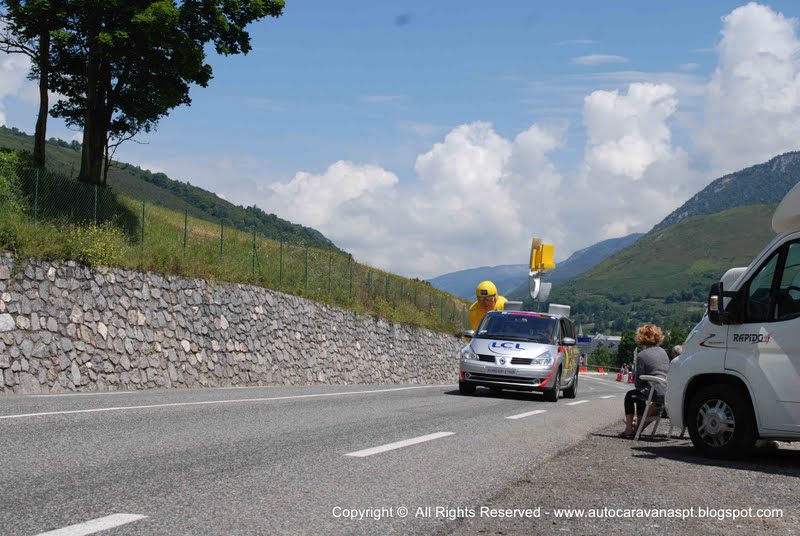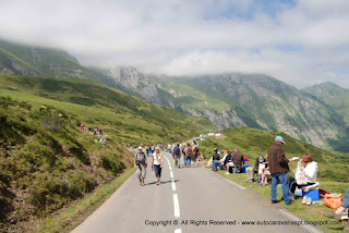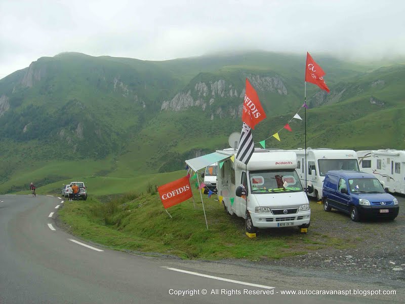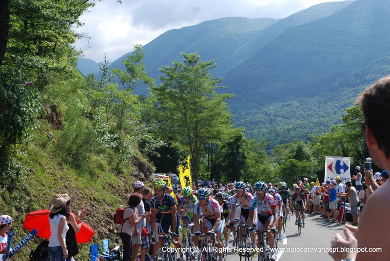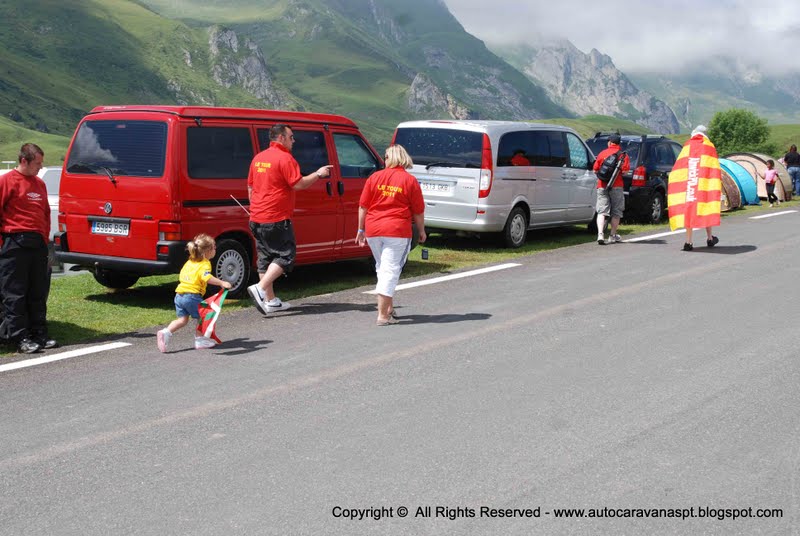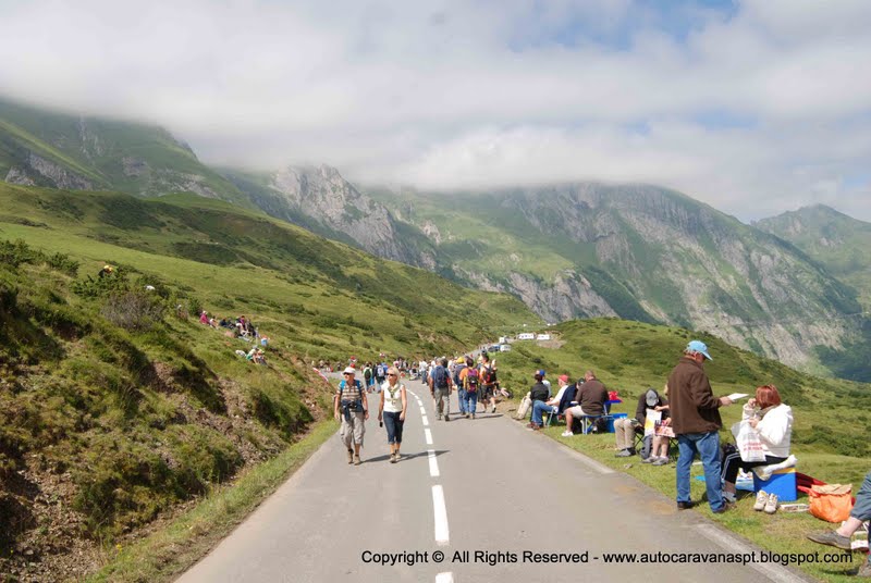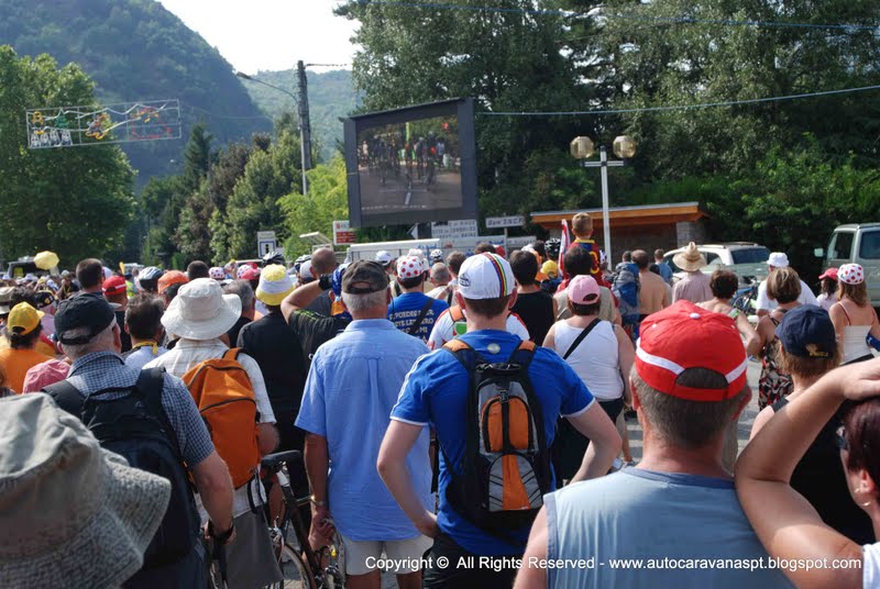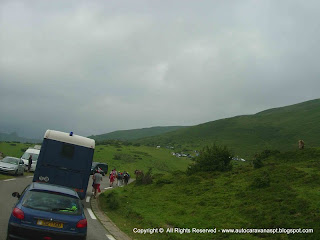 Passados uns km estava já a entrar no percurso do ‘’dia seguinte’’… encosta acima, já com as plateias repletas de AC, automóveis, ‘’roulotes’’, tendas… inimaginável tal mobilização de gentes de inúmeras nacionalidades. Muitos espanhóis! E Franceses, claro!