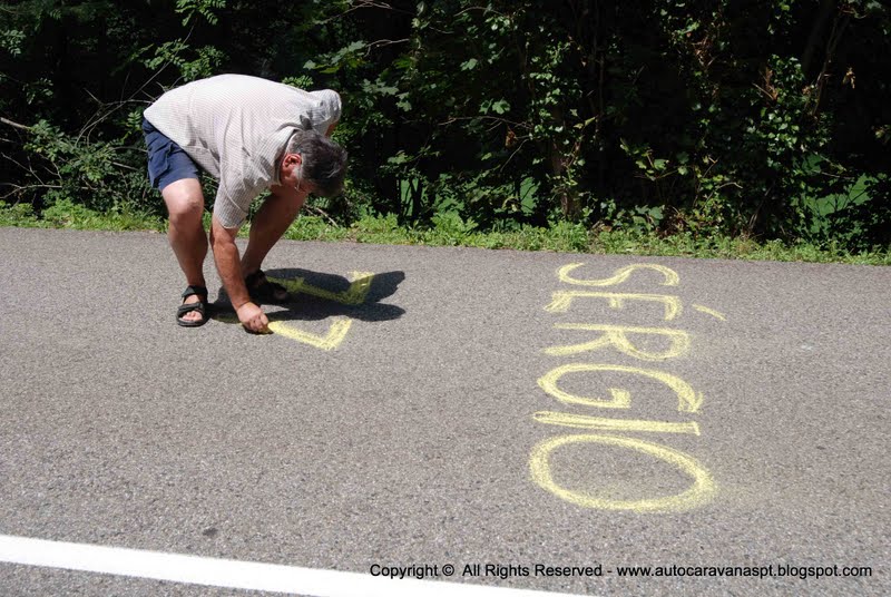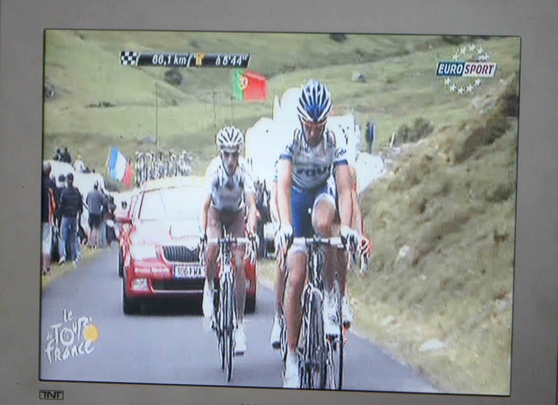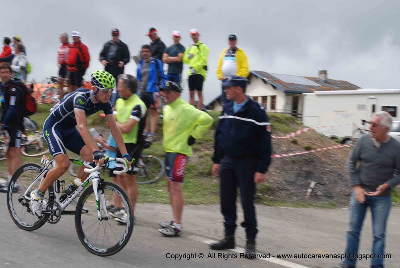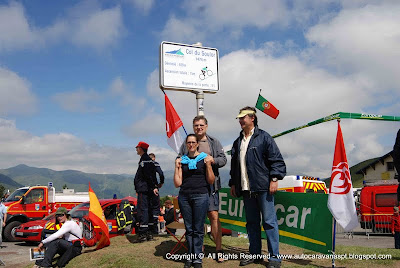 Lá no alto vinha sozinho o Rui Costa, que julgo mais preocupado que as mudanças automáticas da bicicleta se adaptassem à grande descida de 1.000 mts, que o esperava nem ouviu chamar por ele e nem o acenar da sua bandeira natal lhe chamou a atenção. Está desculpado este simpático jovem nortenho.