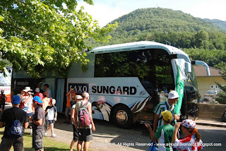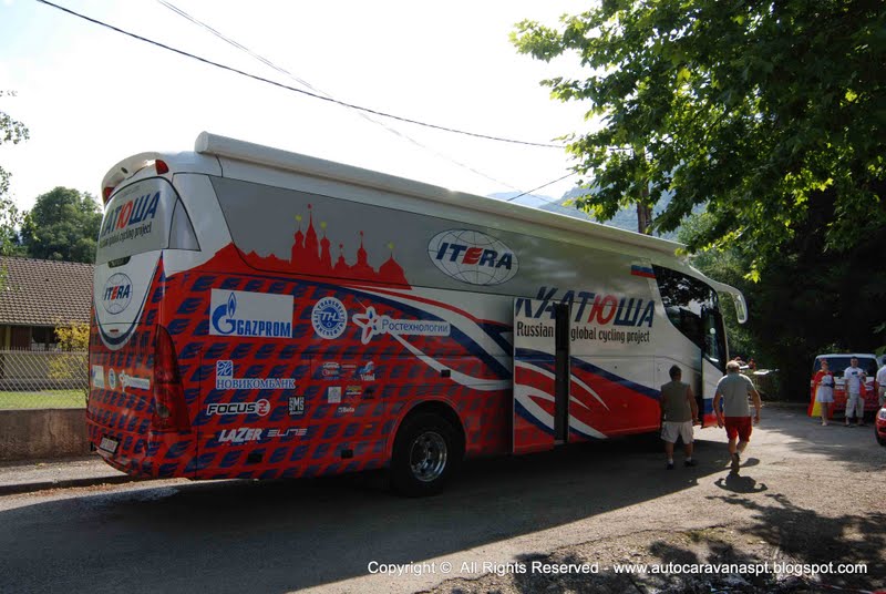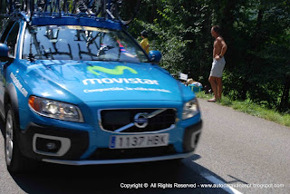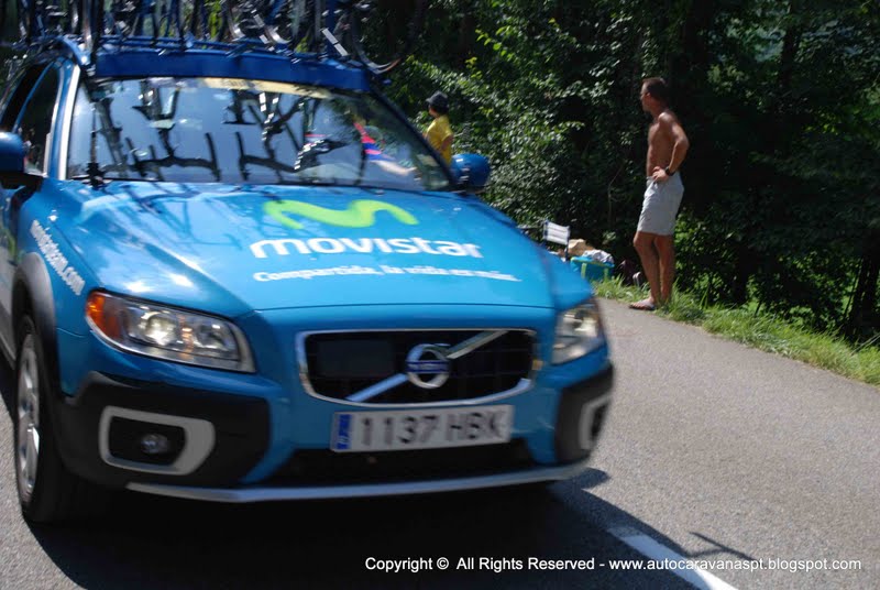 Aguardei junto ao Autocarro da Movistar para fazer uma foto com o Rui,… mas… nabice que assumo, olhei sempre para a estrada onde passavam centenas de ‘’corredores’’ misturados com os ciclistas já que nesta etape se sabia que os ciclistas desceriam ao 15 km até LES CABANNES, eis senão quando, o primeiro autocarro a partir… já com os ciclistas lá dentro, foi mesmo o da Movistar… acontece que provavelmente terão vindo em viaturas e não dei pela sua chegada… foi pena… teria fechado em beleza a experiência.