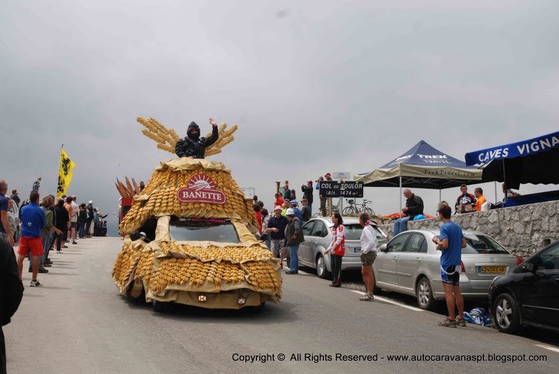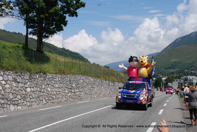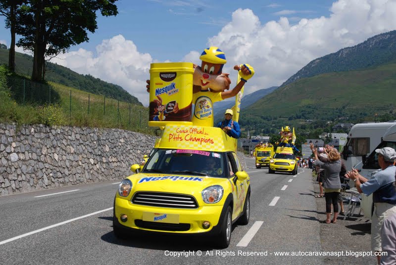 Lá no alto antes de chegar a ‘’tal caravana publicitária’’, aterram 5 helis de Tv’s e um outro da Polícia… a caravana chega, e … a mesma cena… os arremessos de porta-chaves, rebuçados, chapéus, camisolas, bonés… tudo a fazer voos para conseguir ‘’un cadeaux’’ …